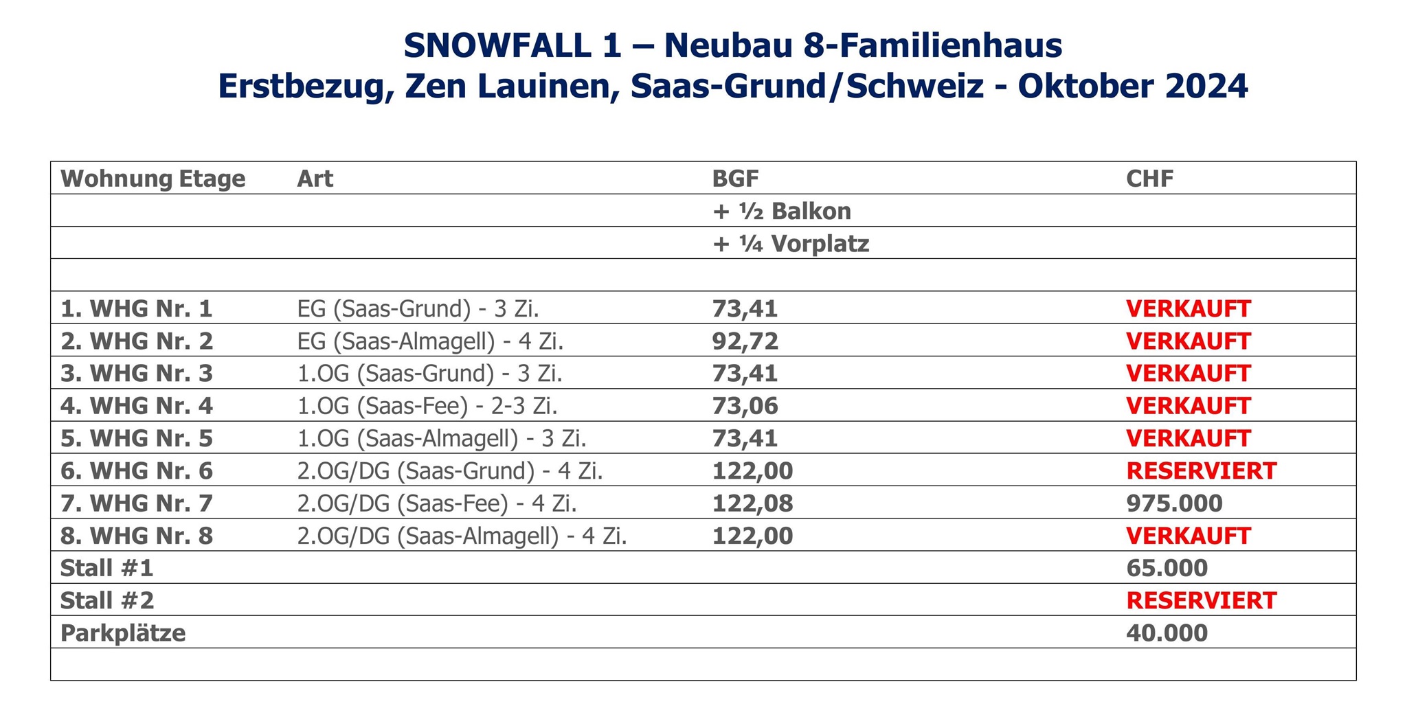 Objektart: 8 eigenständige Wohnungen | EG: 2 x 3ZKBT | 1.OG: 3 x 3ZKBB | 2.OG & DG als Duplexwohnungen: 3 x 4ZKBB | 2 historische Stadel | Freistehendes 8- Familienhaus mit unbeschreiblichem Gletscherblick | Schweizer Neubauqualität | Fertigstellung Herbst 2025 | Baubeginn ist erfolgt.